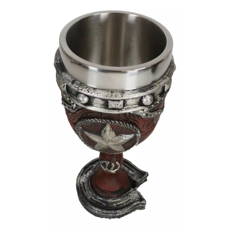 • This Western Stars And Horseshoes Wine Goblet is made of high quality resin with stainless steel liner, individually hand painted and polished. Color Tone May vary from pictures. Handwash only, applying soap to the stainless steel liner cup but using warm water/very mild soap on the resin housing.