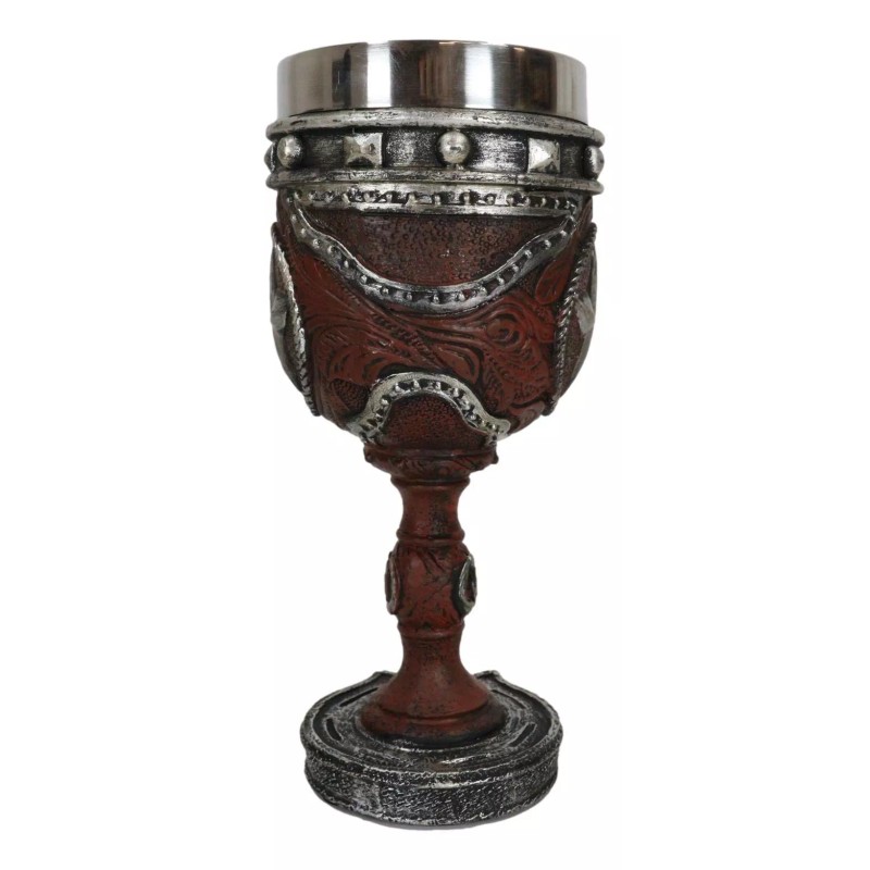 • This Western Stars and Horseshoes Wine Goblet is perfect for your western themed parties or as a functional home decor! This western themed larger than life wine goblet boasts of all American western themed articles such as the Western Stars, braided ropes floral scroll lace patterns, horseshoes and all put together in a tooled leather finish.