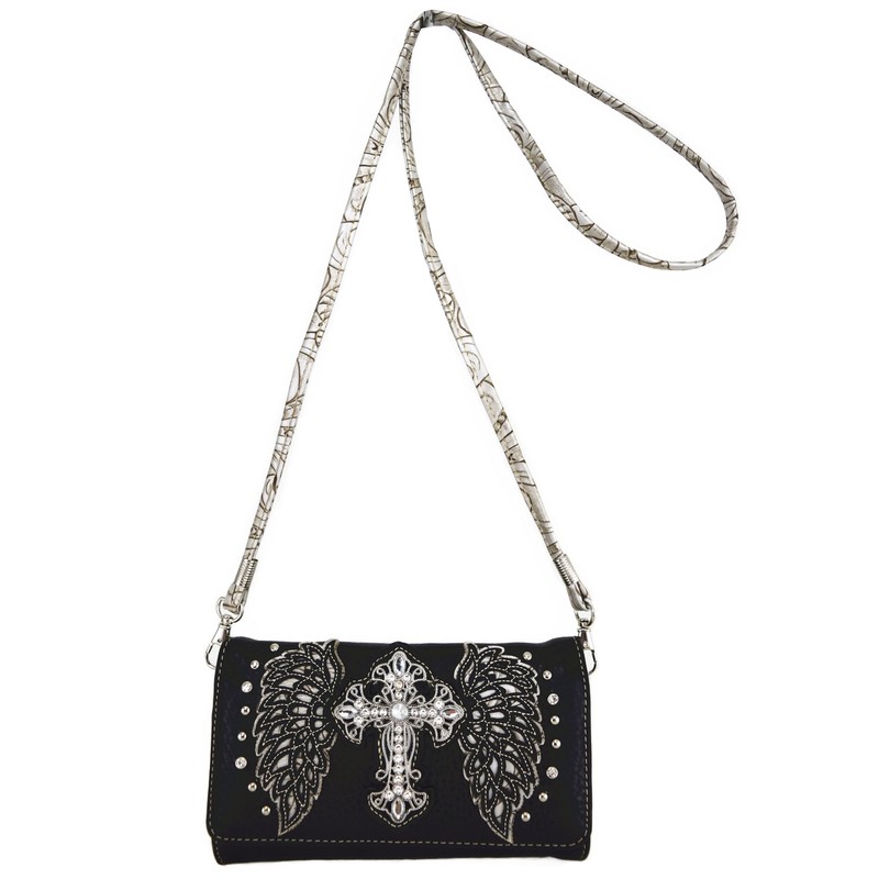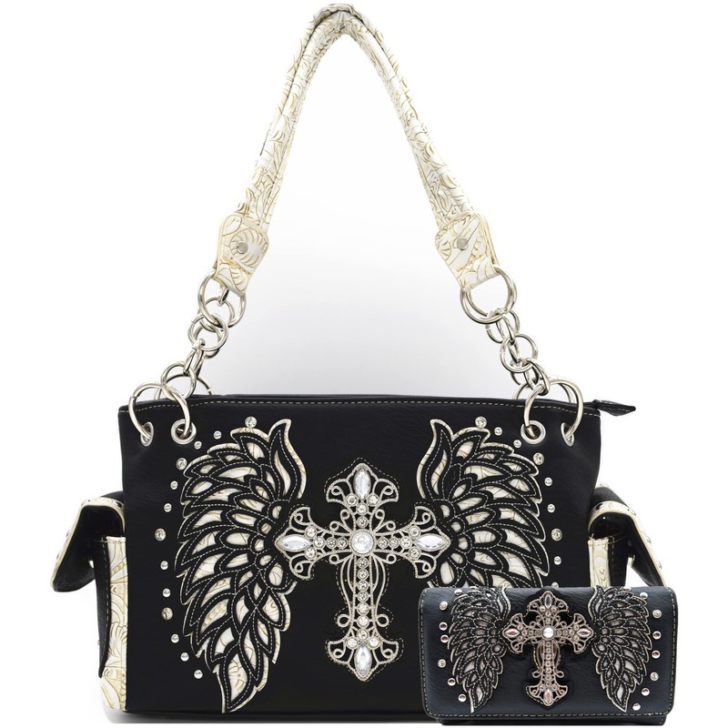 Western Style Rhinestone Cross Studded Laser Cut Wings Tooled Leather Purse Women Handbags Country Shoulder Bag Wallet Set (2Black/Silver Set)