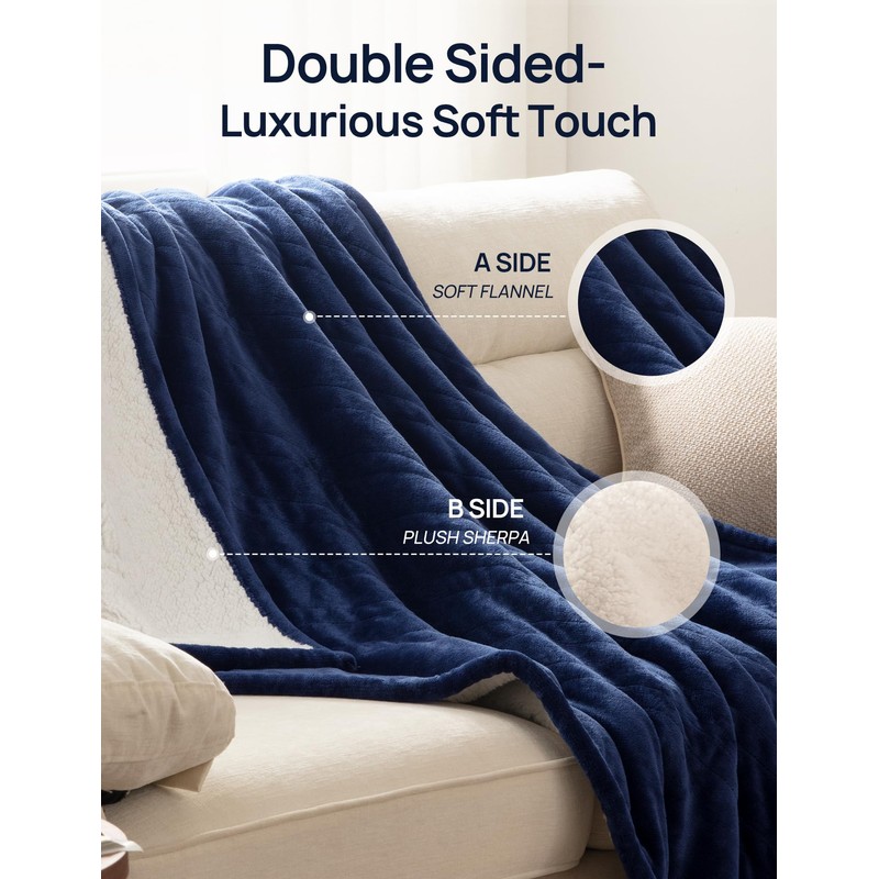 Westinghouse Electric Blanket with Foot Pocket for Adults, Ultra Soft Flannel to Sherpa Heated Throw with 6 Heating Levels & 2-10 Hours Time Settings, Fast Heating & Machine Washable, 50x62, Navy Blue