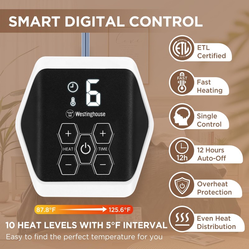 - 【INTELLIGENT SINGLE CONTROL & OVERHEATING PROTECTION】 Westinghouse heated blanket supports 20-minute warm-up, help to quickly start the heating process, so you don't have to wait too long to lie under a warm quilt. 1-12 hour automatic shutdown, overheating protection and other functions, let you use it more confidently. 10 heating settings, the temperature can be adjusted freely. The length of the power cord is 72 + 156 inches