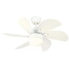 - White ceiling fan finish, white finish blades, light kit with opal frosted glass includes one candelabra base 5.5 watt G16-1/2 LED bulb