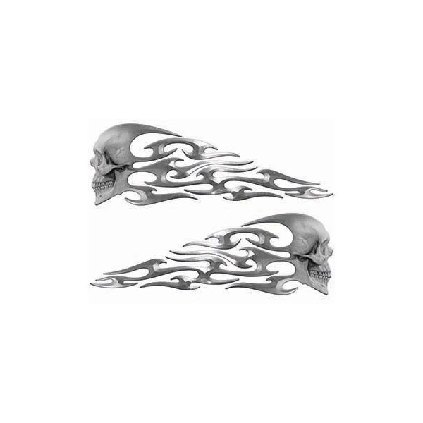 Tribal Style Evil Skull Flame Graphics in Silver from Weston Ink. Flame decal kits work for just about anything you want to add that extra look to. We have other sizes listed and work great for Trucks, Cars, Motorcycles, Bikes, Helmets, Golfcarts, ATV, Off road vehicles, SUV, or anything with a flat smooth surface. Designed and produced by Weston Ink using the highest quality materials and latest printing technology. New inks also extend the life of the graphic for years to come without any fading. These decals make a great factory replacement option for anyone looking for something a touch more personalized.