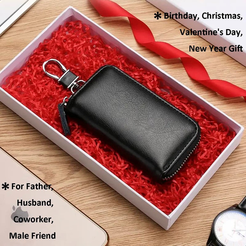 - Mens / Womens premium leather Key Holder Case. Material: Soft cowhide leather with high-quality silver metal buckle. Superior stitching and craftsmanship for a key wallet that lasts
