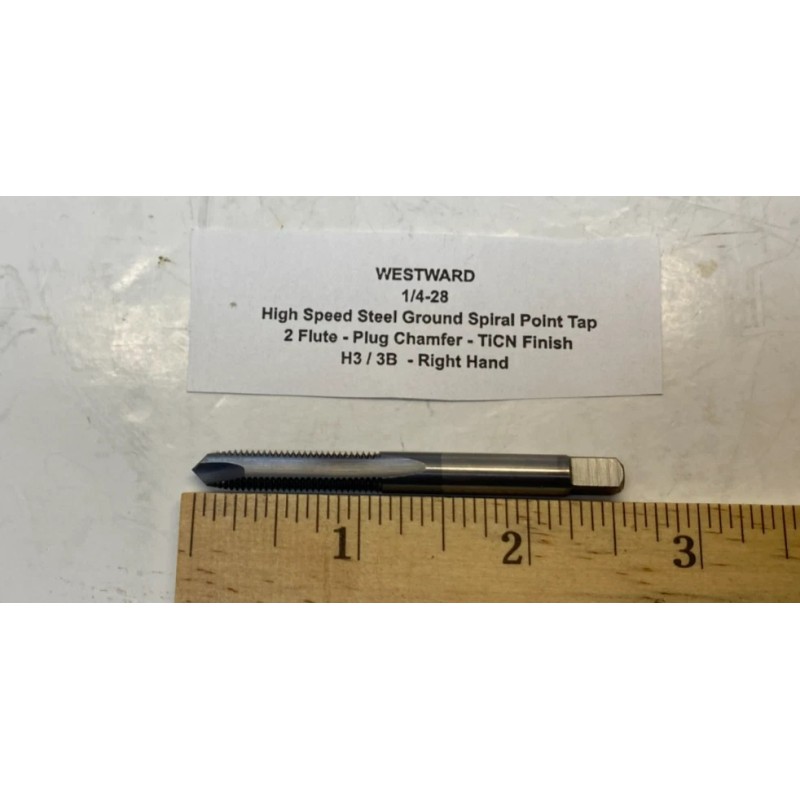 WESTWARD 1/4-28 HSS Ground Spiral Point Tap - 2 Flute Plug Chamfer - TiCN Finish