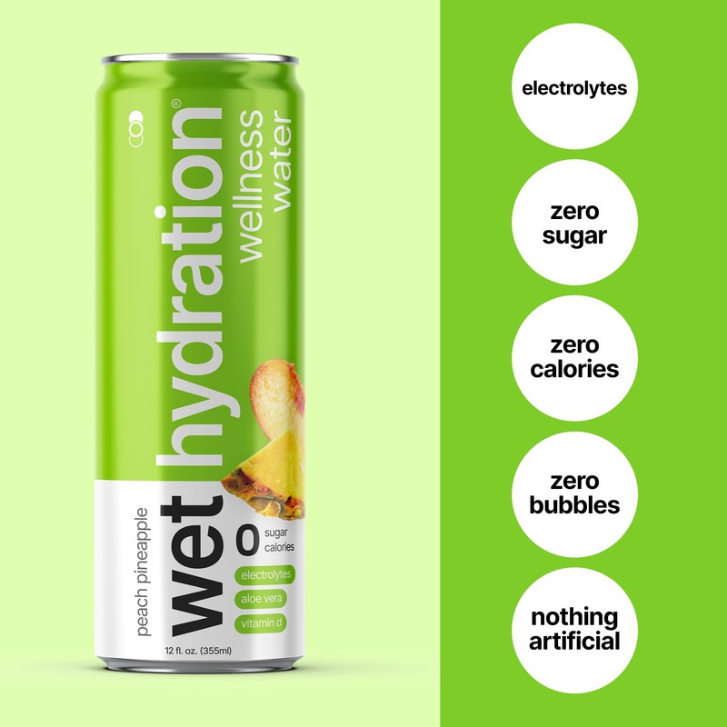Wet Hydration, Zero Calorie, Functional Wellness Water - Peach Pineapple (12 Ounce Cans, Pack of 12) - Flavored Water, Hydration Drink, No Sugar, No Artificial Ingredients, Zero Calories (Packaging May Vary)