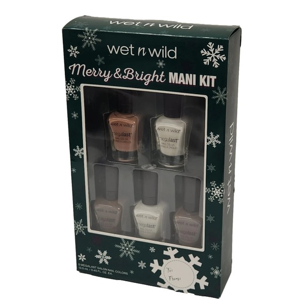 Let your nails glow with cozy winter vibes! The Wet n Wild âMerry & Brightâ Mani Kit brings you five salon-quality Megalast nail colors in a neutral dream palette â perfect for sweater season, office chic, or holiday glam.