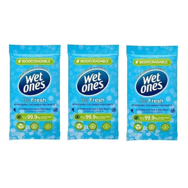 Wet Ones (Be Fresh) with Refreshing Cucumber Fragrance - Antibacterial Hand Wipes - Dermatologically Tested, Biodegradable, Ideal for Travel (3 X packs (36 Wipes Total))