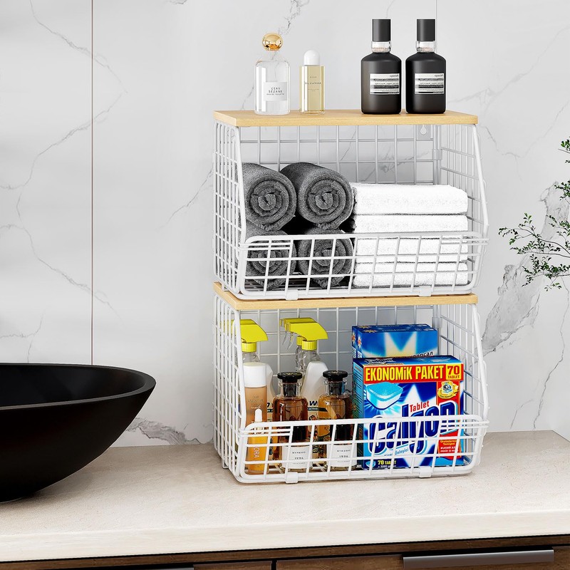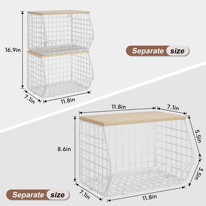 - 【Sturdy & Practical】Each package comes with 2pcs wire storage basket with a wood top, it is a sturdy & functional storage basket that stores fruits, veggies, produces, bread, snacks, and your favorite dressing, you can see what is inside, and let air flow freely. The simplicity of the design and the amount of storage, improve the uselessness of the strange corner of the counter, making the kitchen look neat and organized