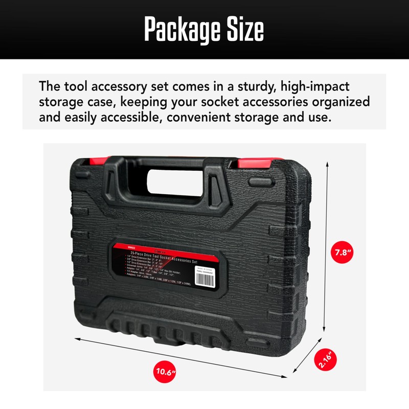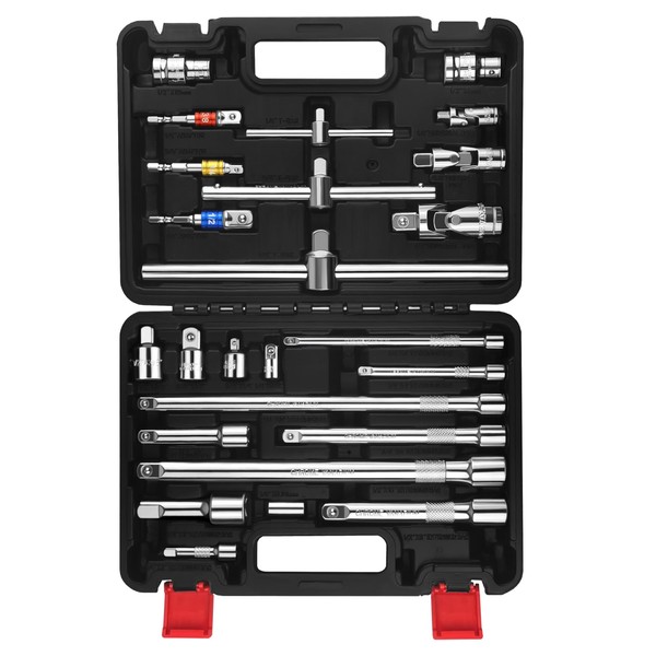 - 25 Pieces Socket Accessories Set: 1/4" Drive Extension Bar: 2", 4", 6"; 3/8" Drive Extension Bar: 3", 6", 10"; 1/2" Drive Extension Bar: 3", 5",10"; Universal Joints: 1/4", 3/8", 1/2"; 1/4" Hex Bit Holder; Adapter: 1/4", 3/8", 1/2"; T-Bar: 1/4", 3/8", 1/2"; 1/2 Adapter: 8mm; 10mm; Adapters: 1/4F x 3/8M, 3/8F x 1/4M, 3/8F x 1/2M, 1/2F x 3/8M).