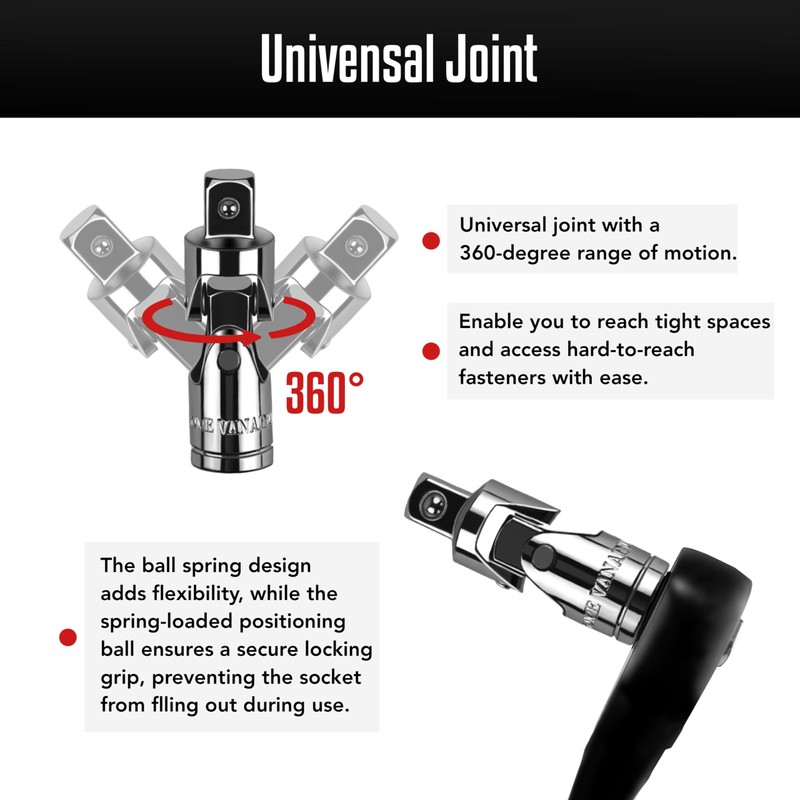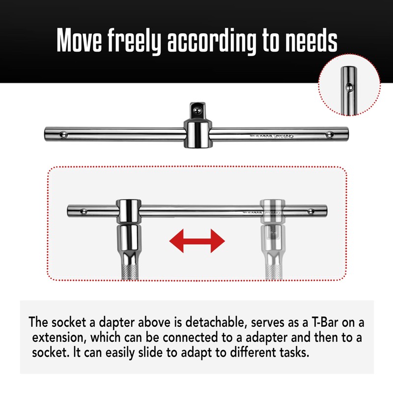 - Versatile Compatibility: This socket accessory is designed to work seamlessly with both 1/4", 3/8", 1/2" electric and hand tools, Includes extension bar, adapter, universal joint and T-Bar, spring-loaded brake ball on top of each accessory ensures a secure fastening