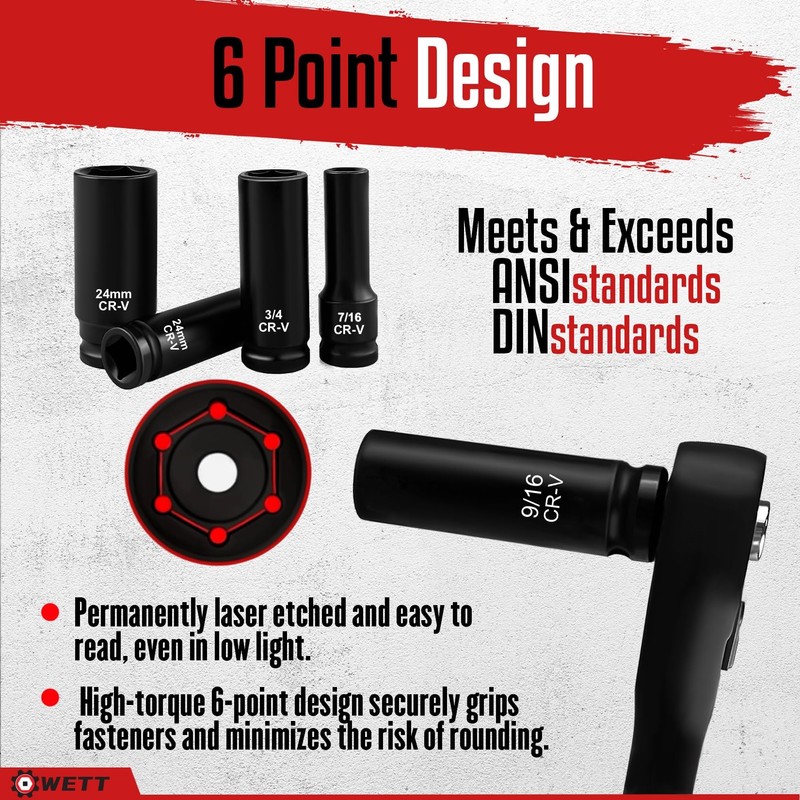 - Size Clearly: Each deep socket is permanently laser-etched with easy-to-read size markings. This ensures effortless identification, even in low-light conditions, allowing for quick and accurate tool selection