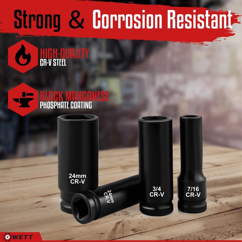 WETT 29-Piece 1/2" Drive Impact Socket Set, Deep Sockets (3/8" - 1", 10-24mm) with Extension Bar, Cr-V Steel, SAE & Metric, 6 Point