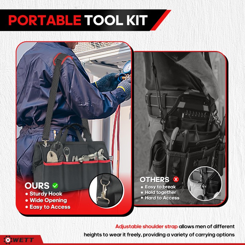 - Quick Access Design: The wide opening and internal metal frame structure of this technician tool bag allow for easy retrieval and identification of tools, preventing collapse and ensuring hassle-free usage on the job site