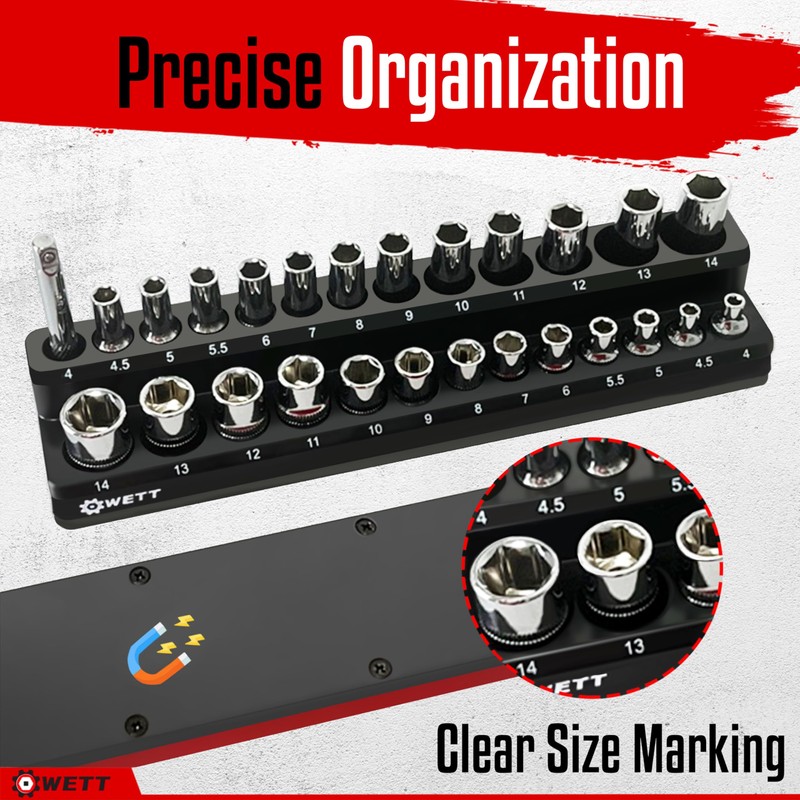 WETT Magnetic Socket Organizer Set, 6-Piece Socket Holder Set, 1/4", 3/8", 1/2" Drive Magnetic Sockets Trays, Holds 143pcs SAE & Metric, Standard Shallow and Deep Size Sockets (Socket not Included)