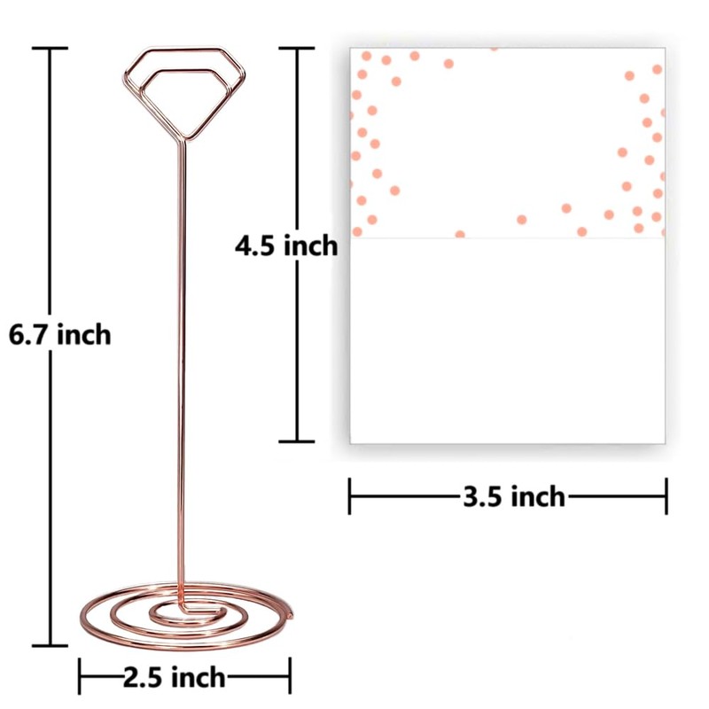 - √ Best Style-Matching Sets--12Pcs Diamond shaped place card holders and 14Pcs place cards with rose gold dots, The rose gold place card holders match rose gold place cards perfectly, so you can get them together and saving time to search for cards.