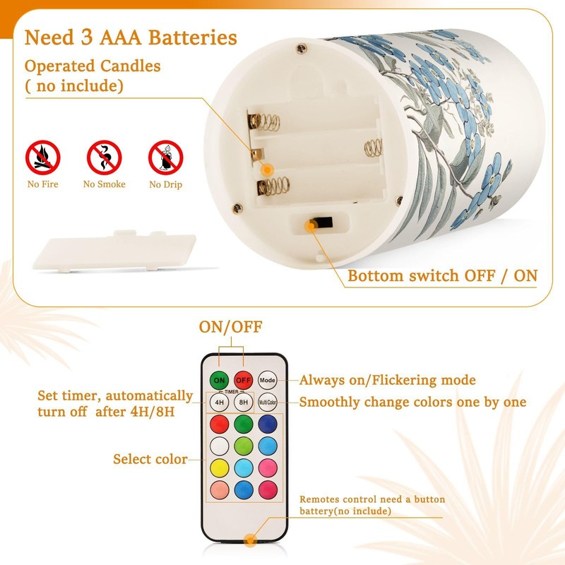 - REMOTE CONTROL: Multi-function 18-key remote control. You can remotely control the candles turn on/off, adjust the light colors, flicker or stop. Timer allows candles to light for 4/8 hours and automatically turn off, cycle every 24 hours.