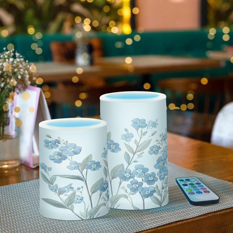 WEVIBOFU Blue Flowers Leaves Painting Flickering Flameless Candles LED Battery Operated with Remote Timer Pillar Candles for Home Birthday Wedding Christmas Decor, Set of 2