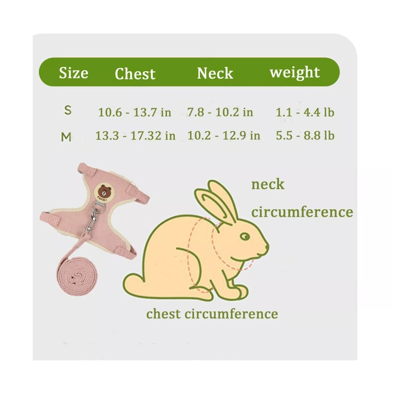 - Size RangeS: neck circumference: 7.8 "-10.2", chest circumference: 10.6 "-13.7", M: neck circumference: 10.2 "-12.9", chest circumference: 13.3 "-17.32". Suitable for small and medium-sized pets such as rabbits, guinea pigs, hedgehogs, chinchillas, and other small pets. The length of the towing rope is 47 inches. It allows your rabbit or other small animals to move freely without restrictions and without feeling hindered.