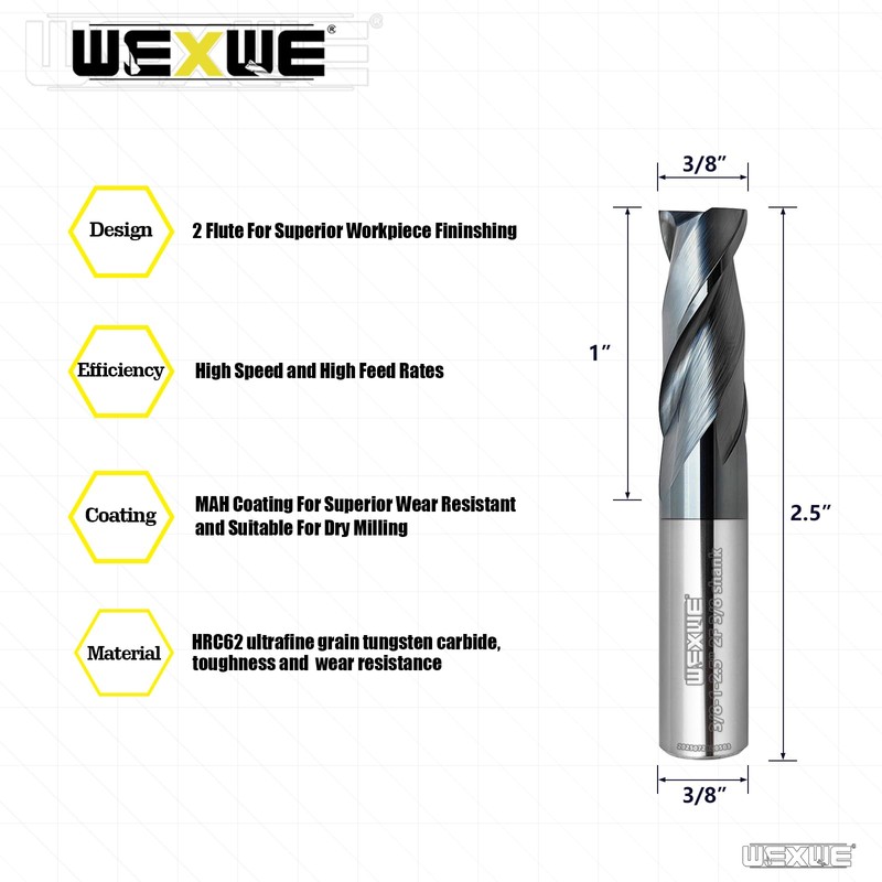 WEXWE Tools 2 Flute Carbide End Mills, Square Milling Cutter for Cutting Alloy Steels,Cast Iron,Aluminum -Chisel Edge Suitable for Vertical Milling Processing - 3/8 Shank (3/8-2.5" 2PCS)