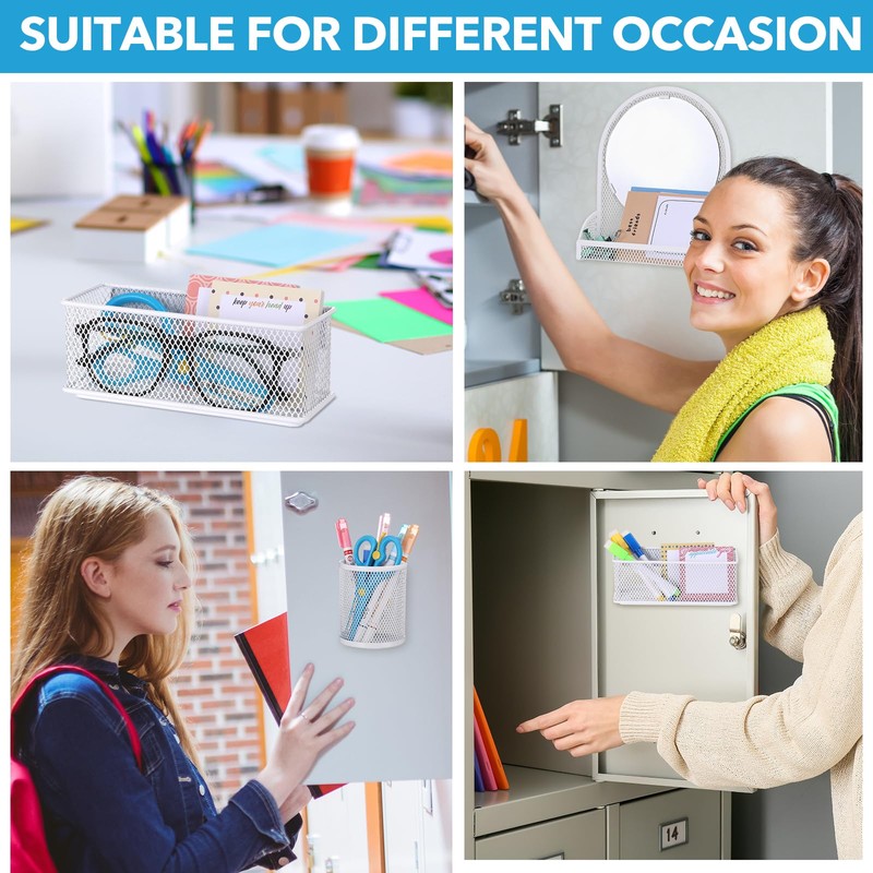 • Wide Applications: pen holders and storage baskets can keep your issues within reach and mirrors can be applied to quickly organize or check clothing; These locker accessories kits will help you organize anywhere there are different surfaces, such as lockers, refrigerators, whiteboards, etc
