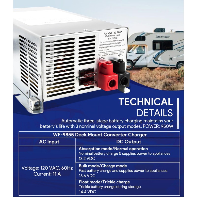 - 【Great Compatibility】 WF-9855 55Amp Deck Mount RV Power Converter/Chargers is versatile, advanced power source solutions. Perfect Replacement for RV Trailer Camper 9800 Series (55 Amp). WF-9855 model provides 55 Amps of clean, reliable DC power, even without filtering from a battery, which is ideal for powering electronics and appliances.