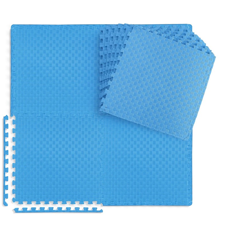 - Cover 24 SQ.FT. - 6 tiles (24'' x 24'' x 1/2'') blue tatami pattern Eva foam floor mats Interlock together covers approx. 24 square feet of the floor area, perfect space for gym equipment or workout on it, and also safe for kids as playground.