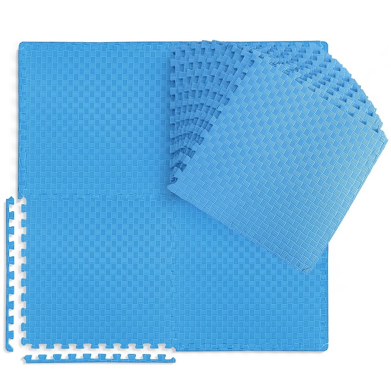 - Cover 96 SQ.FT. - 24 tiles (24'' x 24'' x 1/2'') blue tatami pattern Eva foam floor mats Interlock together covers approx. 96 square feet of the floor area, perfect space for gym equipment or workout on it, and also safe for kids as playground.