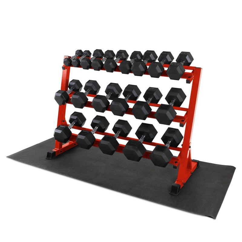 - Rubber Feet and Multi-Level Design - The rack features rubber feet for stability, preventing the rack from moving and absorbing shock during dumbbell racking. Additionally, it safeguards your gym floor by providing a protective layer between the rack and the surface. The 3-tier design with angled shelves offers convenient access and storage for dumbbells, accommodating 6-, 8-, and 12-sided dumbbells.