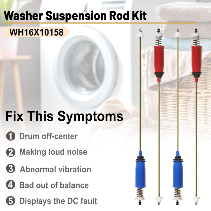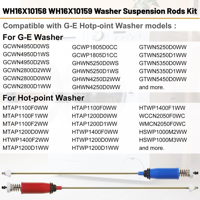 - Premium Quality: Upgrade WH16X10158 WH16X10159 Washer Suspension Rod Set made of premium-quality steel for added strength and durability. designed to withstand vibration and stress for a more stable machine. The kit includes 4 hanging rods, with high elasticity damping springs to effectively reduce the noise made by the washing machine when working