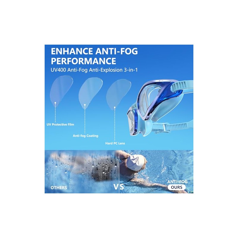 - 🏊【Swimming Goggles Powerful Anti-fog】Anti-fog coating, fogging up your lenses while swimming is never a good thing. The anti-fog coating keeps the lenses clear and you enjoy a superior underwater world