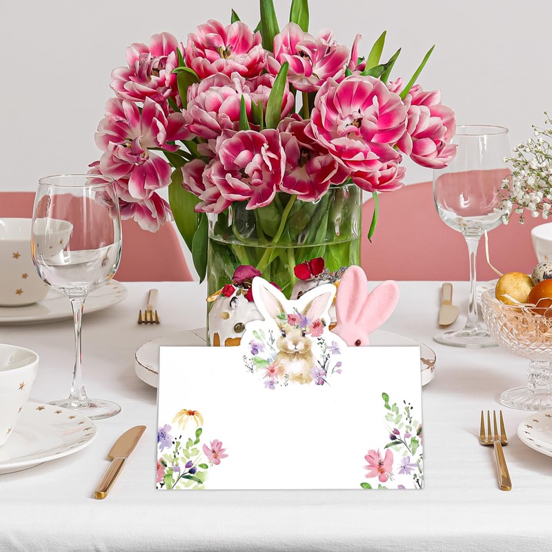 Whaline 100Pcs Easter Place Cards 2 x 3.5 Inch Easter Bunny Flower Tent Name Cards Watercolor Rabbit Blank Seat Assignment Label Cards for Easter Spring Table Setting Supplies