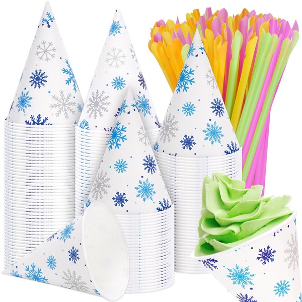Whaline 200Pcs Snow Cone Cups and Spoon Straws Kit 4.5oz Leakproof Cone Paper Cups Snowflake Printed Disposable Cone Cups for Shaved Ice Slush Sorbet Ice Cream Decoration Party Supplies