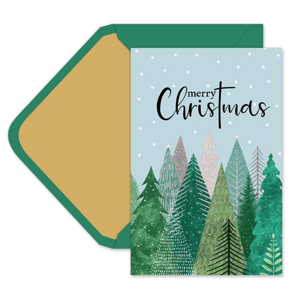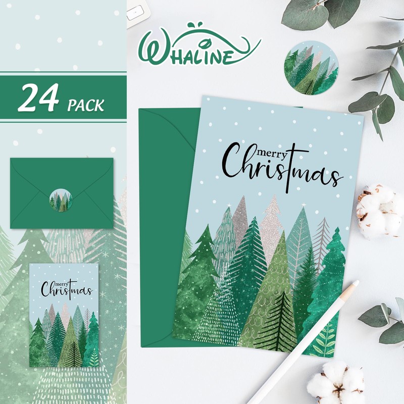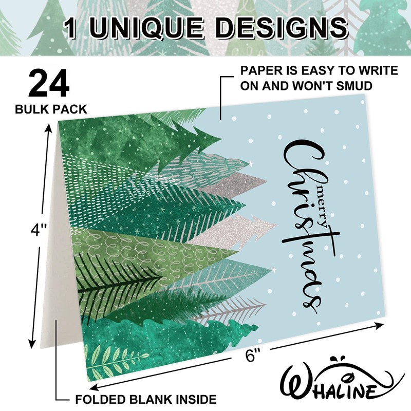 Whaline 24 Pack Merry Christmas Greeting Cards Green Forest Note Cards with Envelopes Stickers Xmas Tree Blank Cards for Winter Invitation Celebration, 4 x 6 Inch