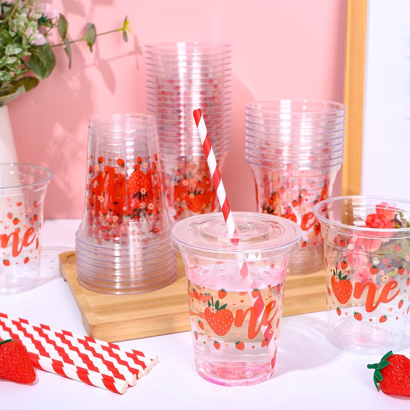 - Strawberry Design - Our clear cups with lids and straws are printed with cute red strawberries and letters ONE, make them more delicate and attractive, matching straws are in red and white stripe design, all people will love these lovely cups set.