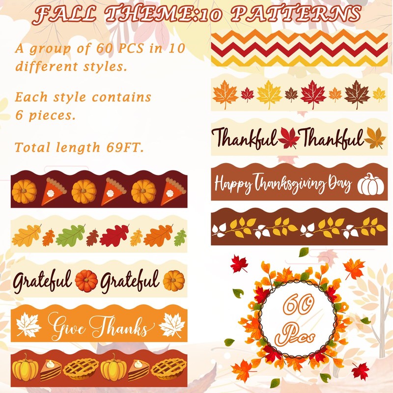 - Package Includes - 60pcs fall theme bulletin border stickers in 10 designs, each design contains 6pcs, sufficient for classroom decoration to welcome the coming of fall and thanksgiving.