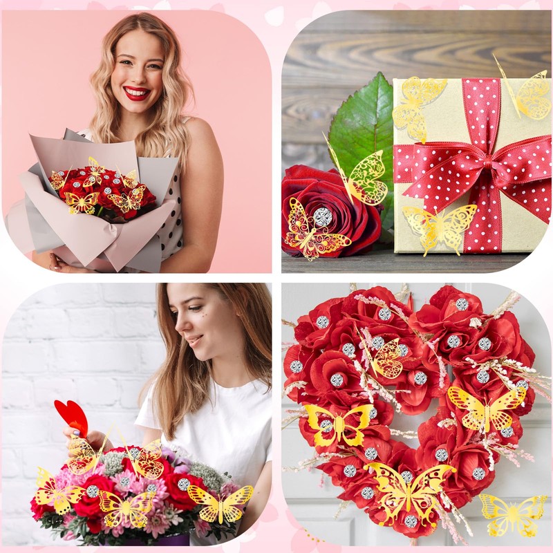 - You Will Get - 100pcs rhinestone flower pins, 48pcs gold 3D butterfly ornaments and 15 sheets of flower wrapping paper are in the package, abundant and rich enough to meet your decoration needs.