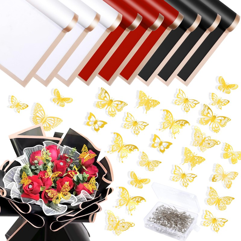 Whaline Wedding Corsages Set 100Pcs Bouquet Wedding Corsages Pins 48Pcs 3D Gold Butterfly Wall Decor 15 Sheet Flower Wrapping Paper Black Red White for Wedding Mother's Day Birthday Party