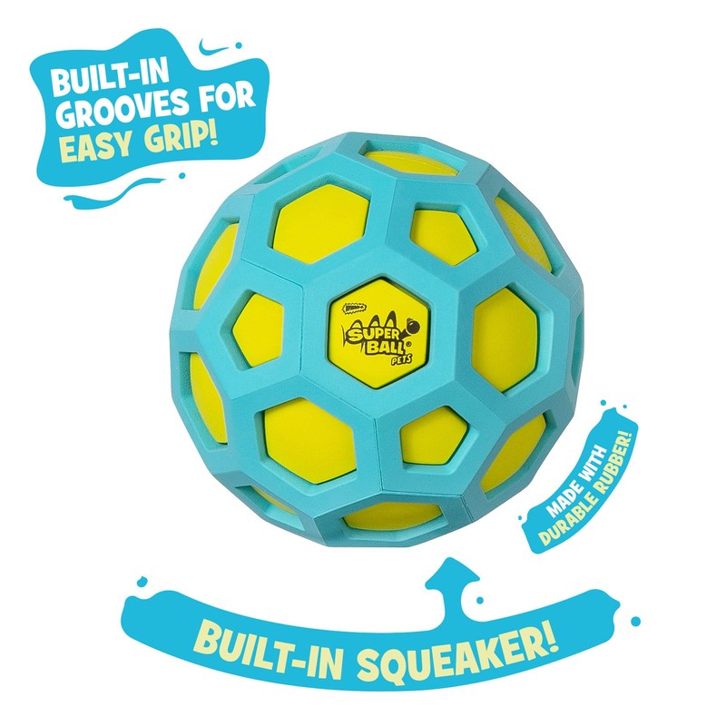 - SOCCER LIKE: Play your pooch on the pitch with the Wham-O Pets SuperBall Geo Squeak Ball.