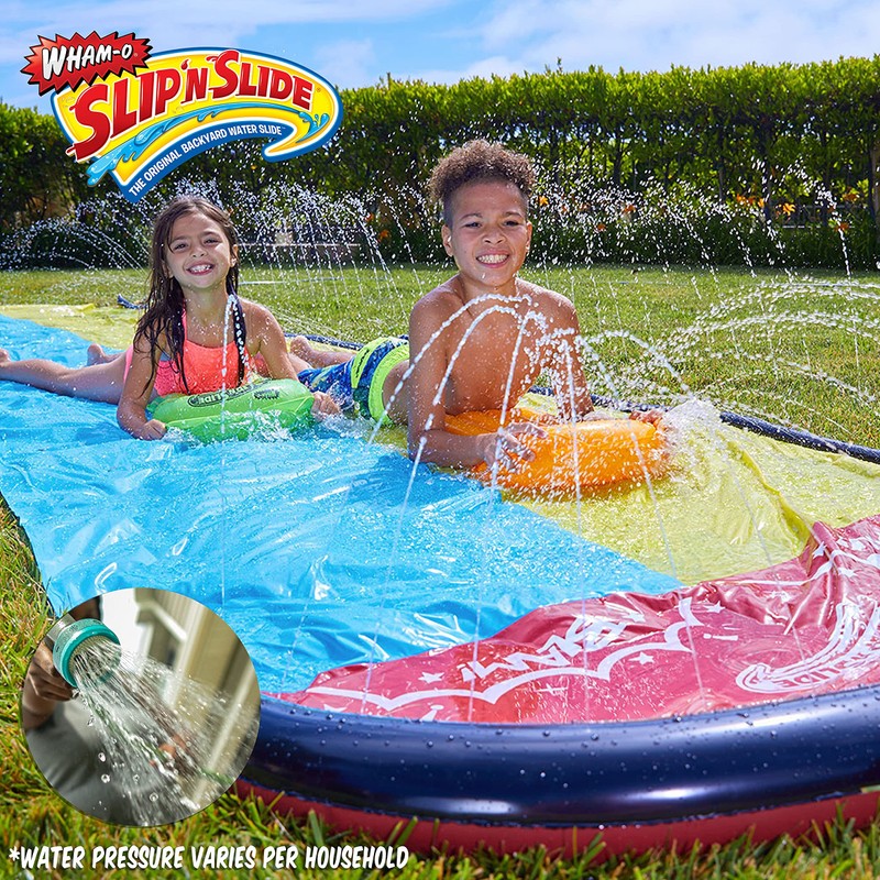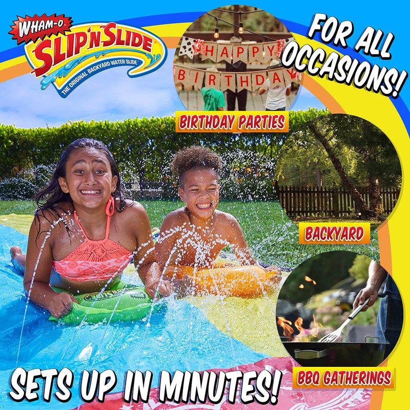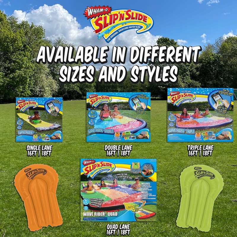 Product DescriptionWham-O Slip 'N Slide Double Wave Rider. the Original Backyard water slide. For ages 5 to 12. With 2 bonus Slide Boogies Included.From the ManufacturerWham-O Slip 'N Slide Double Wave Rider. the Original Backyard water slide. For ages 5 to 12. 15 foot slide area. With 2 bonus Slide Boogies Included.