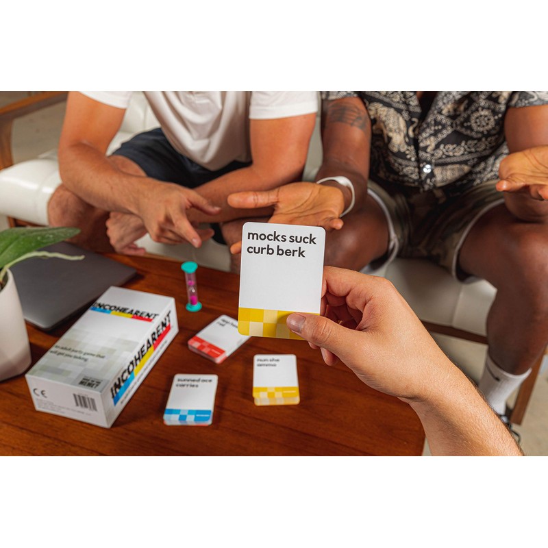- Get Guessing: A rotating judge holds a card up so that only they can see the answer, but everyone else sees the Incohearent phrase. Everyone else reads the front of the card aloud. Whoever decodes the phrase first wins the card. When the card has been decoded or the translators have elected to pass, the judge pulls the next card. Once 3 cards have been decoded, the round is over, and the next person becomes the judge.