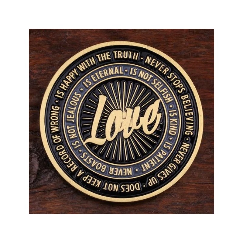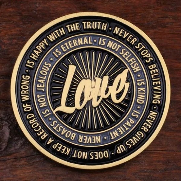 ...This stunning 1.75” antique brass coin aims to define the word “love” with help from Corinthians. The coin displays two doves facing each other in front a heart outlined with the question “WHAT IS LOVE?” above it and the passage “I Corinthians 13:4-8” below. On the back of the coin, honest statements like “Love … is not selfish,” “never boasts,” and “does not keep a record of wrong” in gray and black are in rings symbolizing the never ending nature of love. A great wedding gift or a great way to honor the love of your life