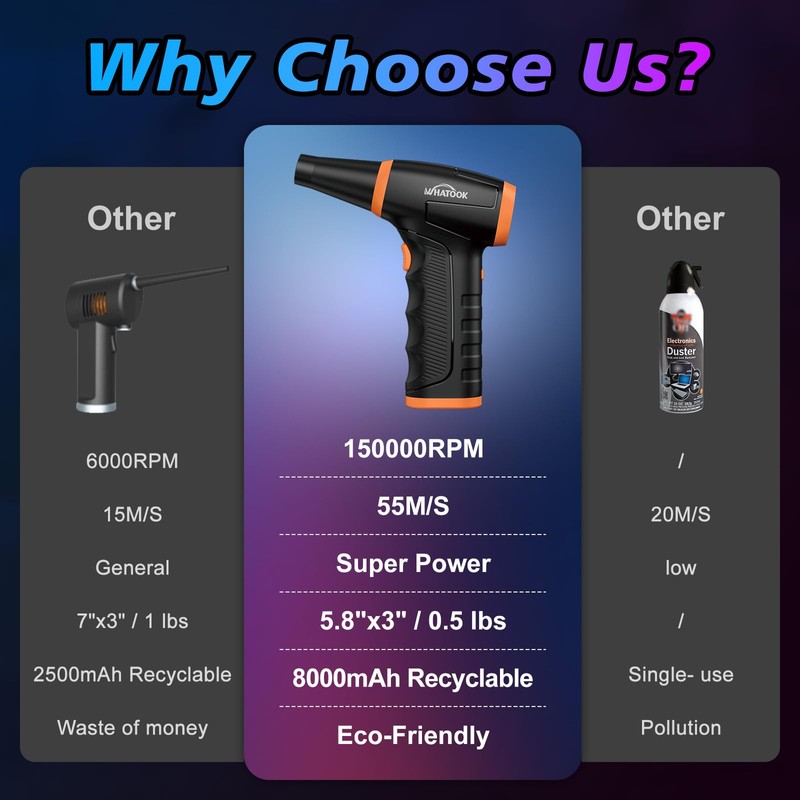WHATOOK Elektrische Staubgebläse Druckluftspray für PC Reinigungsset, 3-Gang 150000 U/min Compressed Air Duster mit 8000mAh Akku, USB Wiederaufladbar Luftdruckspray für Laptop, Elektronik, Auto, Sofa