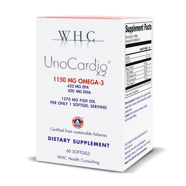 WHC, UnoCardio X2 Fish Oil, Triglyceride Omega-3 Fatty acids, 1270 mg Fish Oil Supplement (622 mg EPA / 420 mg DHA/Total 1150 mg of Omega-3 per Serving), Natural Orange, 60 softgels