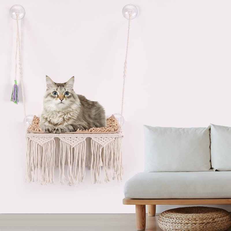 • Cat Bed for Window - WHDPETS Boho style macrame braided cat bed is made of breathable woven fabrics,suitable for summer use to help cats lose heat. In winter, Come with a mattress on this pet cat hammock, this cat window shelf will be the best cozy cat perch.