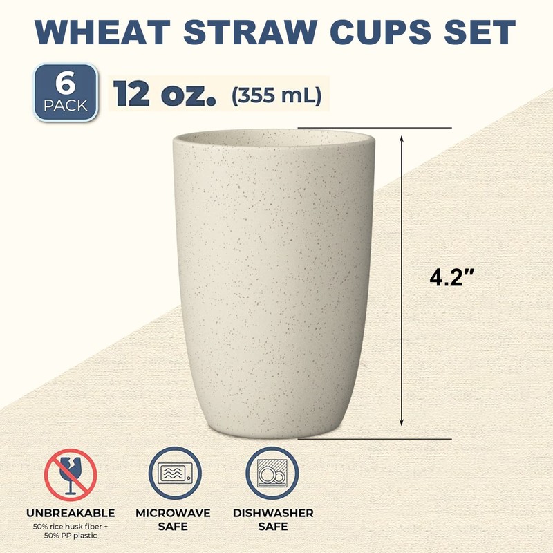 Wheat Straw Cups 6 PCS Good Alternative to Plastic Reusable Cups 12 oz Unbreakable Drinking Cup Reusable Dishwasher Safe Water Plastic Glasses Beige