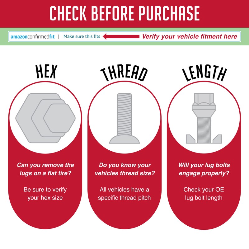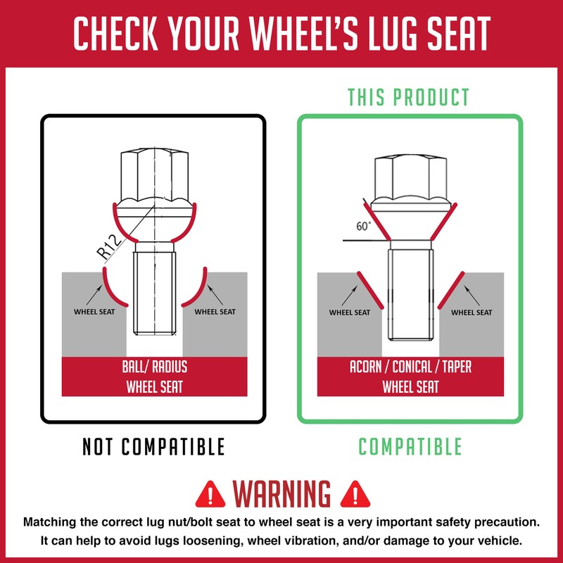 - ❌ Lug Bolts are designed for AFTERMARKET wheels. The thread may be correct for your OE vehicle, however the lug seat is may be not large enough to create enough clamping force to safely bolt the OE wheel to your vehicle. Please confirm lug seat requirements before purchase.