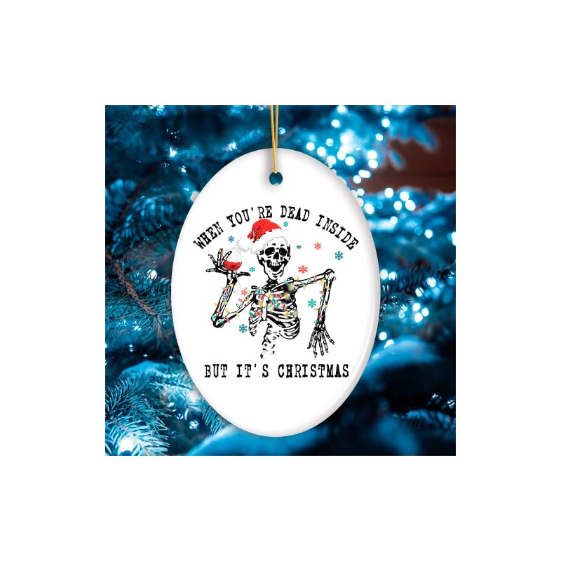 This ornament is a whimsical and unique addition to your Christmas tree, featuring a playful design that reads "When You're Dead Inside But It's Christmas" alongside an image of a skeleton dressed up as Santa Claus, holding a glass of wine. The ornament is made of lightweight yet durable materials, with a high-quality print that captures the detail and vibrancy of the design. This ornament is a great gift for anyone who loves to add a bit of humor and personality to their Christmas tree, or for those who appreciate the finer things in life, like a good glass of wine