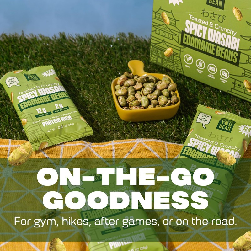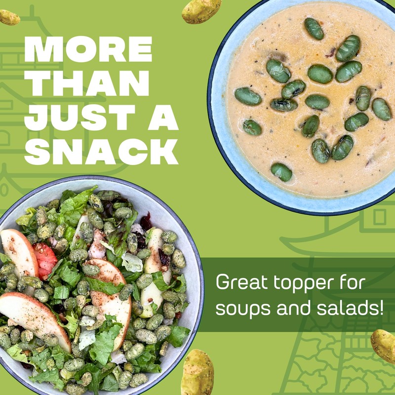 - - Experience a kick of bold, spicy wasabi in every bite! Our roasted edamame delivers an explosion of flavor that's perfect for those who love a little heat with their crunch. Our Japanese inspired treat combines the crunch of roasted edamame with a quick and hot kick, while offering a satisfying crunch better than nuts, pistachios, chickpeas, and chips ~ but with a unique and delicious twist.