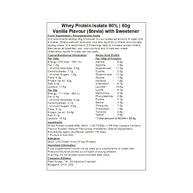 Whey Protein Isolate 90% - All Flavours (Vanilla - Stevia, 60g (2 Servings))